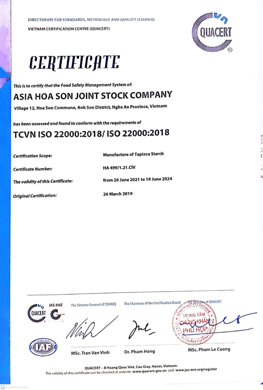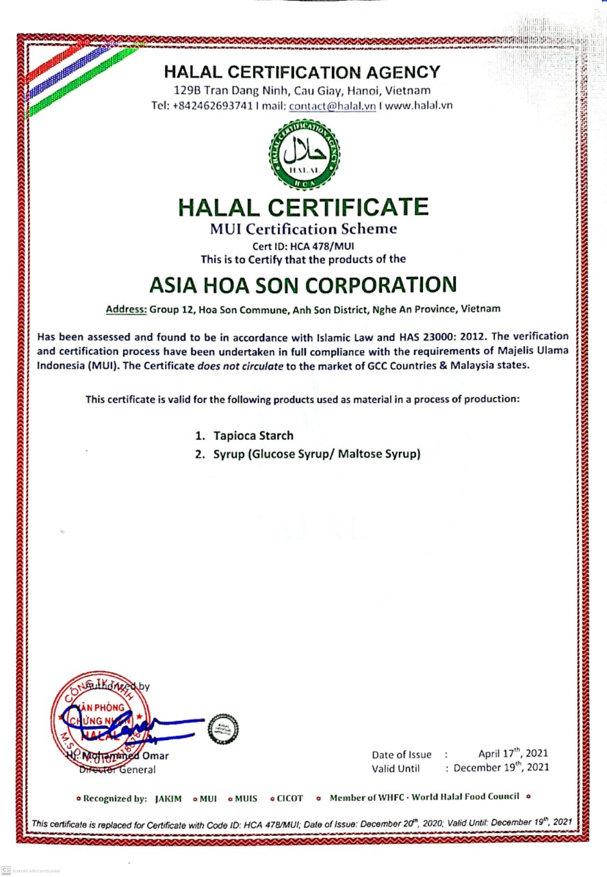 Công ty Cổ phần Á Châu Hoa Sơn tiền thân là công ty TNHH Chế biến nông sản Hoa Sơn được UBND tỉnh Nghệ An cấp Giấy chứng nhận Đăng ký dầu tư lần đầu ngày 23/01/2015 và sửa đổi bổ sung lần 2 ngày 26/7/2019. Ngành nghề sản xuất kinh doanh chính: Sản xuất chế biến tinh bột sắn, bã sắn sấy khô và đường lỏng Glucose syrup. Nhà máy được đầu tư xây dựng trên tổng diện tích 30.000m2 tại xóm 12 xã Hoa Sơn, huyện Anh Sơn, tỉnh Nghệ An, một trong những vùng có trữ lượng sắn dồi dào và chất lượng nhất Việt Nam. Dây chuyền sản xuất sản phẩm của Công ty được nhập khẩu từ Thụy Điển, Ấn Độ, Thái Lan cho ra công suất hơn 150 tấn tinh bột, 60 tấn bã sắn sấy khô và 100 tấn Glucose/ ngày.